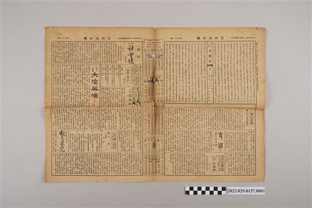 1.本物件為三六九小報社發行《三六九小報》第六十一號,發行人為趙雅福,正面為阿公店興產公司、蘭記書局、吉豊洋行等9個廣告;背面為雜爼專欄「秋鳴館苦笑錄」、花叢小記等內容;翻開內頁有明史說部「金魁星」、史遺專欄「小試瑣談(二)」,說海專欄社會小說「社會鏡第二回(十三)」、現代長篇「大陸英雄(十四)」等文章。2.《三六九小報》發行時間自昭和5年(1930)至昭和10年(1935),旨以刊登戲謔、針砭時事之文,反映當時的社會狀況。