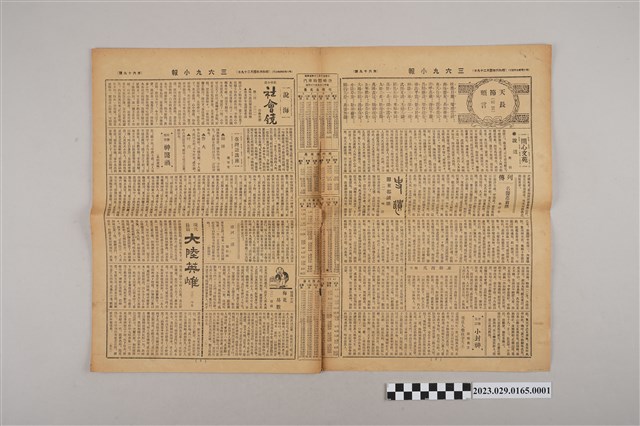 1.本物件為三六九小報社發行《三六九小報》第六十九號,發行人為趙雅福,正面為伊達新三郎商店臺南支店、蘭記書局、平和軒俱樂部等9個廣告;背面為雜爼專欄「幸盦隨筆」等內容,下方有一女子的照片;翻開內頁有天長節頌言、列傳「名醫范翁傳」,說海專欄社會小說「社會鏡第一回(二一)」、現代長篇「大陸英雄(二二)」等文章。2.《三六九小報》發行時間自昭和5年(1930)至昭和10年(1935),旨以刊登戲謔、針砭時事之文,反映當時的社會狀況。