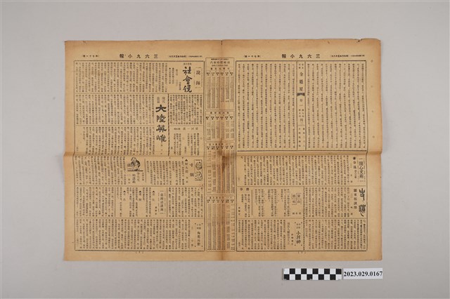 1.本物件為三六九小報社發行《三六九小報》第七十一號,發行人為趙雅福,正面為上海眼鏡製造公司、臺南時計講習會、太原醫院等10個廣告;雜爼專欄「風俗小話」、噴飯錄等內容;翻開內頁有明史說部「金魁星」、史遺專欄「東都談賸(三)」,說海專欄社會小說「社會鏡第三回(二三)」、現代長篇「大陸英雄(二四)」等文章。2.《三六九小報》發行時間自昭和5年(1930)至昭和10年(1935),旨以刊登戲謔、針砭時事之文,反映當時的社會狀況。