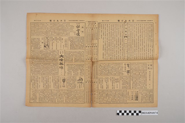 1.本物件為三六九小報社發行《三六九小報》第七十八號,發行人為趙雅福,正面為阿公店興產公司、新吉川履物部景品係、吉豊洋行等9個廣告;雜爼專欄「幸盦隨筆」、古香零拾等內容;翻開內頁有明史說部「金魁星」、開心文苑「媽祖婆作對」,說海專欄社會小說「社會鏡第三回(三○)」、現代長篇「大陸英雄(三一)」等文章。2.《三六九小報》發行時間自昭和5年(1930)至昭和10年(1935),旨以刊登戲謔、針砭時事之文,反映當時的社會狀況。