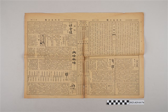 1.本物件為三六九小報社發行《三六九小報》第八十號,發行人為趙雅福,正面為臺灣法律新報社、吉豊洋行、三六九小報社等9個廣告;雜爼專欄「幸盦隨筆」、古香零拾等內容;翻開內頁有明史說部「金魁星」、開心文苑「頭々是道」,說海專欄社會小說「社會鏡第三回(三二)」、現代長篇「大陸英雄(三三)」等文章。2.《三六九小報》發行時間自昭和5年(1930)至昭和10年(1935),旨以刊登戲謔、針砭時事之文,反映當時的社會狀況。