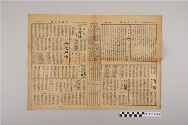 1.本物件為三六九小報社發行《三六九小報》第八十四號,發行人為趙雅福,正面為採芳線香商店、蘭記書局、吉豊洋行等7個廣告;雜爼專欄「梅館巵說」、花叢小記等內容;翻開內頁有明史說部「金魁星」、開心文苑「妓女從良說」,說海專欄社會小說「社會鏡第四回(三六)」、現代長篇「大陸英雄(三七)」等文章。2.《三六九小報》發行時間自昭和5年(1930)至昭和10年(1935),旨以刊登戲謔、針砭時事之文,反映當時的社會狀況。