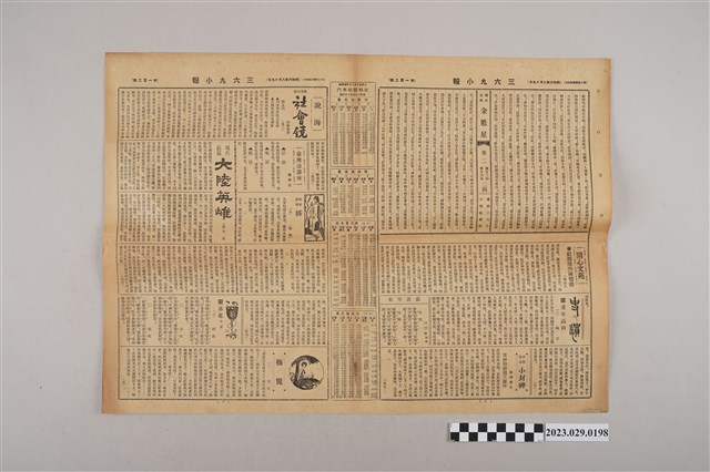 1.本物件為三六九小報社發行《三六九小報》第一百二號,發行人為趙雅福,正面為阿公店興產公司、蘭記圖書局、大山洋服店等7個廣告;雜爼專欄「幸盦隨筆」、花叢小記等內容;翻開內頁有明史說部「金魁星」、史遺專欄「童年高科(二)」、開心文苑「大丈夫辯」,說海專欄社會小說「社會鏡第五回(五二)」、現代長篇「大陸英雄(五四)」等文章。2.《三六九小報》發行時間自昭和5年(1930)至昭和10年(1935),旨以刊登戲謔、針砭時事之文,反映當時的社會狀況。