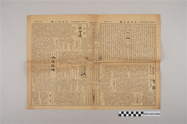 1.本物件為三六九小報社所發行《三六九小報》第一百十號,發行人為趙雅福,報紙正面刊登和光醫院、嘉南商行、臺灣法律新報社及大山洋服店等廣告,背面為雜爼專欄、詩壇專欄以及花叢小記等文章,翻開內頁則為社會鏡、大陸英雄、金魁星等若干長篇連載,內頁中間印有汽車時刻表。2.《三六九小報》發行時間至昭和5年 (1930)至昭和10年 (1935)。旨以刊登戲謔、針貶時事之文,反映當時的社會狀況。