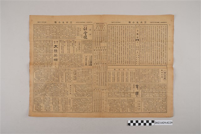 1.本物件為三六九小報社所發行《三六九小報》第百三十三號,發行人為趙雅福,報紙正面刊登伯壎齒科醫院、辰馬商行及寶美樓料理店等廣告,背面為雜爼專欄、詩壇專欄以及花叢小記等文章,翻開內頁則為社會鏡、大陸英雄、金魁星等若干長篇連載,內頁中間印有汽車時刻表。2.《三六九小報》發行時間至昭和5年 (1930)至昭和10年 (1935)。旨以刊登戲謔、針貶時事之文,反映當時的社會狀況。