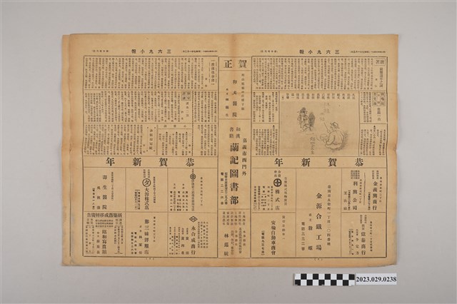 1.本物件為三六九小報社所發行《三六九小報》第百四十二號,此物件為兩件一組,分別為三六九小報第百四十二號以及該號的新年增刊,主刊正面刊登有伯壎齒科醫院、辰馬商行及永安公司等廣告,新年增刊號則刊有新年詞、連雅堂的雅言等文章,以及下方的恭賀新年名單。2.《三六九小報》發行時間至昭和5年 (1930)至昭和10年 (1935)。旨以刊登戲謔、針貶時事之文,反映當時的社會狀況。