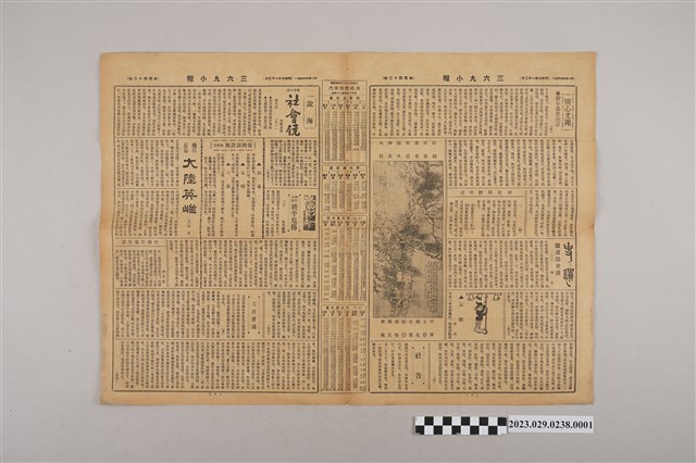 1.本物件為三六九小報社所發行《三六九小報》第百四十二號,發行人為趙雅福,報紙正面刊登伯壎齒科醫院、辰馬商行及永安公司等廣告,背面為雜爼專欄、詩壇專欄以及花叢小記等文章,花叢小記中刊有1女子照片,翻開內頁則為社會鏡、大陸英雄等若干長篇連載以及右方刊有新年恭喜賀詞,內頁中間印有汽車時刻表。2.《三六九小報》發行時間至昭和5年 (1930)至昭和10年 (1935)。旨以刊登戲謔、針貶時事之文,反映當時的社會狀況。