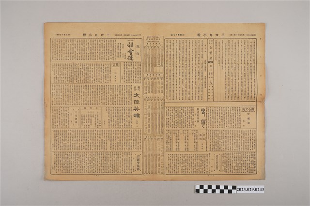 1.本物件為三六九小報社所發行《三六九小報》第百四十七號,發行人為趙雅福,報紙正面刊登伯壎齒科醫院、辰馬商行及協春商店、米穀商伊達新三郎商店臺南支店等廣告,背面為雜爼專欄、詩壇專欄以及花叢小記等文章,翻開內頁則為社會鏡、大陸英雄、新平鬼傳、金魁星等若干長篇連載,內頁中間印有汽車時刻表。2.《三六九小報》發行時間至昭和5年 (1930)至昭和10年 (1935)。旨以刊登戲謔、針貶時事之文,反映當時的社會狀況。