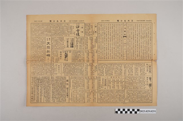 1.本物件為三六九小報社所發行《三六九小報》第百五十五號,發行人為趙雅福,報紙正面刊登伯壎齒科醫院、辰馬商行及日用百科奇書等廣告,背面為雜爼專欄、雅言專欄、花叢小記等文章,翻開內頁則為社會鏡、大陸英雄、新平鬼傳、金魁星等若干長篇連載,內頁中間為詩壇專欄。2.《三六九小報》發行時間至昭和5年 (1930)至昭和10年 (1935)。旨以刊登戲謔、針貶時事之文,反映當時的社會狀況。