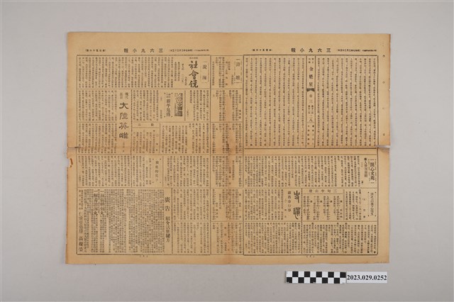 1.本物件為三六九小報社所發行《三六九小報》第百五十六號,發行人為趙雅福,報紙正面刊登伯壎齒科醫院、辰馬商行及日用百科奇書等廣告,背面為雜爼專欄、談藪專欄、花叢小記等文章,翻開內頁則為社會鏡、大陸英雄、新平鬼傳、金魁星等若干長篇連載,內頁中間為詩壇專欄。2.《三六九小報》發行時間至昭和5年 (1930)至昭和10年 (1935)。旨以刊登戲謔、針貶時事之文,反映當時的社會狀況。