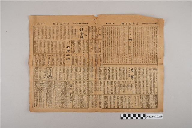 1.本物件為三六九小報社所發行《三六九小報》第百六十四號,發行人為趙雅福,報紙正面刊登伯壎齒科醫院、辰馬商行、和光醫院及日用百科奇書等廣告,背面為雜爼專欄、雅言專欄、古香零拾、花叢小記等文章,翻開內頁則為社會鏡、大陸英雄、金魁星等若干長篇連載,內頁中間為詩壇專欄左下為廣告欄位。2.《三六九小報》發行時間至昭和5年 (1930)至昭和10年 (1935)。旨以刊登戲謔、針貶時事之文,反映當時的社會狀況。