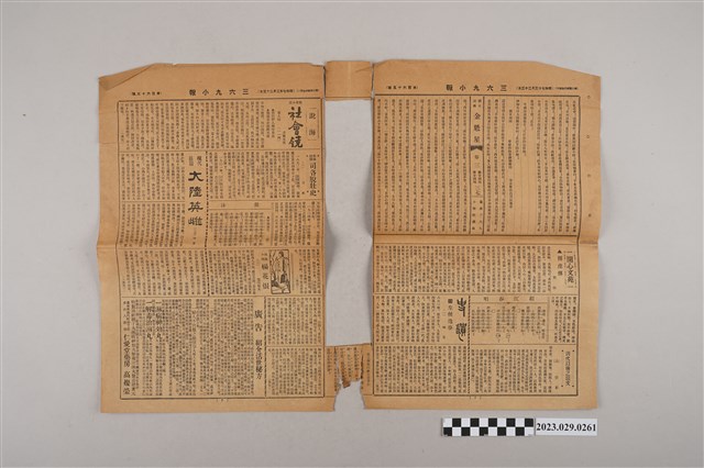 1.本物件為三六九小報社所發行《三六九小報》第百六十五號,發行人為趙雅福,報紙正面刊登伯壎齒科醫院、辰馬商行、和光醫院及日用百科奇書等廣告,背面為雜爼專欄、雅言專欄、古香零拾、花叢小記等文章,花叢小記中刊有三六九小報115號花叢小記中描述之女子許阿英照片,翻開內頁則為社會鏡、大陸英雄、金魁星等若干長篇連載,內頁中間部分缺失左下為廣告欄位。2.《三六九小報》發行時間至昭和5年 (1930)至昭和10年 (1935)。旨以刊登戲謔、針貶時事之文,反映當時的社會狀況。