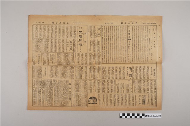 1.本物件為三六九小報社發行《三六九小報》第七十九號,發行人為趙雅福,本報正面為廣告頁,有永茂商行、神農堂、和光醫院、逢安治療所、蘭記書局、沈長泉眼科專門漢藥研究所等六篇廣告;翻開內頁有明史說部金魁星、開心文苑、史遺、詩壇、南極探險「司各脫壯史」等專欄文章,另有說海專欄內的「大陸英雌」、鞠譜遺稿等文章,內頁左下角尚有仁愛堂藥房廣告;背頁則有雜爼「洗耳小錄」、雅言、新聲律啟蒙、耳食齋食譜「烏貓烏狗大會」、淡香園雜錄、花叢小記等文。2.《三六九小報》發行時間自昭和5年 (1930)至昭和10年 (1935)