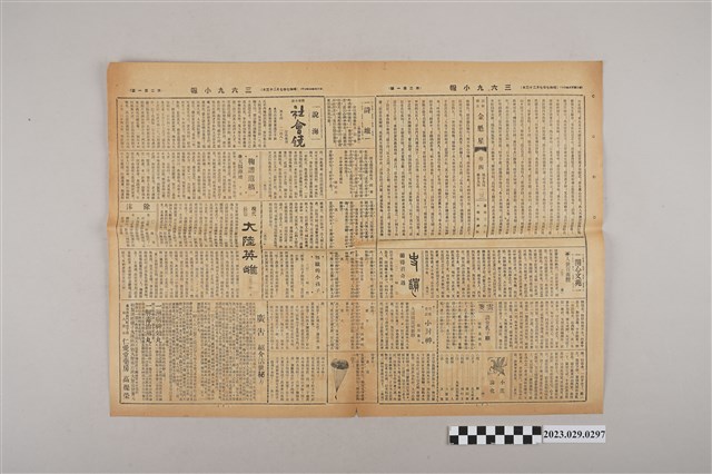 1.本物件為三六九小報社發行《三六九小報》第二百一號 ,正面為廣告,有永茂商行、逢安理學治療所、蘭記書局、石池賣藥類似品製造所、山本齒科醫院等單位;背面寫有雜爼專欄「談乘」、「雅言」、「霜猿日記」、「桐侶吟社雅集」等文章,左下有花叢小記;翻開內頁有「金魁星」、滑稽童話「小封神」、社會小說「社會鏡」、「鞠譜遺稿 (一)」、「無緣的小孩子」、現代長篇「大陸英雌」等文章。2.《三六九小報》發行時間自昭和5年 (1930)至昭和10年 (1935),旨以刊登戲謔、針砭時事之文,反映當時的社會狀況。