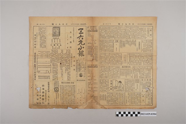 1.本物件為三六九小報社所發行《三六九小報》第二百八號,發行人為趙雅福,報紙正面刊登太原醫院、永茂商行、逢安治療所、山本齒科醫院等廣告,背面為雜爼專欄、雅言專欄、花叢小記等文章,翻開內頁則為大陸英雄、金魁星、天師爺等若干長篇連載,內頁中間為詩壇專欄左下為廣告欄位。2.《三六九小報》發行時間至昭和5年 (1930)至昭和10年 (1935)。旨以刊登戲謔、針貶時事之文,反映當時的社會狀況。