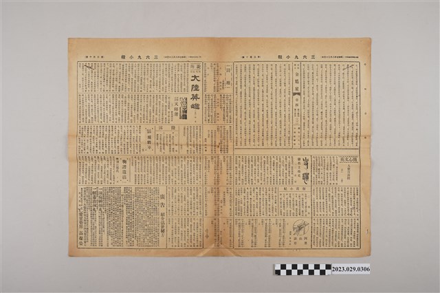 1.本物件為三六九小報社所發行《三六九小報》第二百十號,發行人為趙雅福,報紙正面刊登太原醫院、永茂商行、逢安治療所、英南商行、東亞商業學校等廣告,背面為雜爼專欄、雅言專欄、花叢小記等文章,翻開內頁則為大陸英雄、金魁星、天師爺等若干長篇連載及開心文苑專欄,內頁中間為詩壇專欄左下為廣告欄位。2.《三六九小報》發行時間至昭和5年 (1930)至昭和10年 (1935)。旨以刊登戲謔、針貶時事之文,反映當時的社會狀況。
