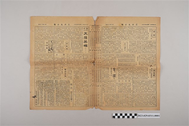 1.本物件為三六九小報社所發行《三六九小報》第二百十五號,發行人為趙雅福,報紙正面刊登太原醫院、永茂商行、逢安治療所、蘭記書局、安步靴店等廣告,背面為雜爼專欄、雅言專欄等文章及刊有一名為錦霞的女子照片,翻開內頁則為大陸英雄等長篇連載及紅柑等短篇著作,右邊刊有開心文苑專欄,內頁中間為汽車時刻表左下為廣告欄位。2.《三六九小報》發行時間至昭和5年 (1930)至昭和10年 (1935)。旨以刊登戲謔、針貶時事之文,反映當時的社會狀況。