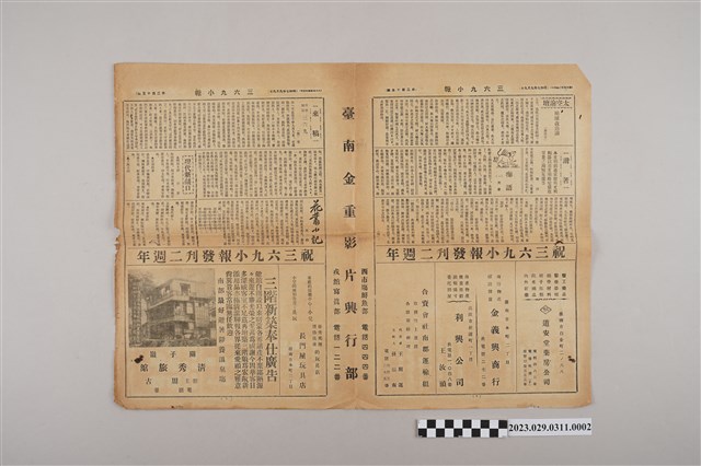 1.本物件為三六九小報社所發行《三六九小報》第215號增刊號,報紙正面中間為詩壇專欄,左下刊登有永森記材木商行、英南商行等廣告,背面為長篇連載金魁星以及下方赤崁麵部、上海眼鏡製造公司等廣告,內頁刊有花叢小記、太空論壇等專欄,以及下方關子嶺清秀旅館、金義興商行等廣告,增刊號每頁皆印有祝三六九小報發刊二周年字樣。2.《三六九小報》發行時間至昭和5年 (1930)至昭和10年 (1935)。旨以刊登戲謔、針貶時事之文,反映當時的社會狀況。