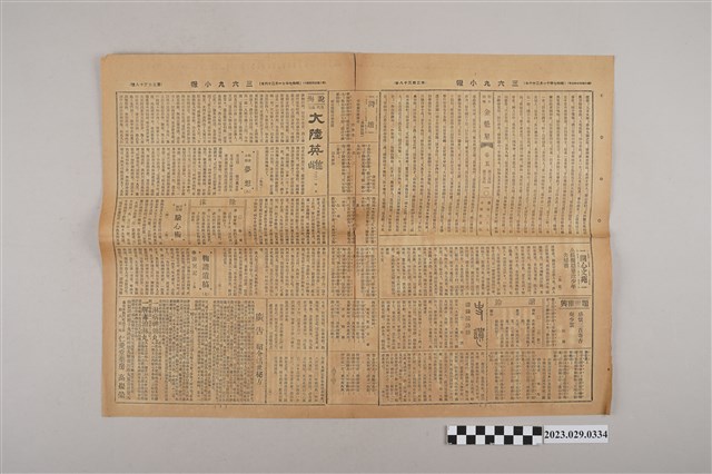 1.本物件為三六九小報社發行《三六九小報》第二百三十八號,發行人為趙雅福,本報正面為廣告頁,可見太原醫院、永茂商行、逢安治療所、新刊小說、長門屋玩具店等廣告;背面有雜爼專欄「雅言」、小常識、新聲律啟蒙等等;翻開內頁有開心文苑、詩壇、長篇小說「大陸英雄」、鞠譜遺稿等專欄文章。2.《三六九小報》發行時間至昭和5年 (1930)至昭和10年 (1935)。旨以刊登戲謔、針貶時事之文,反映當時的社會狀況。