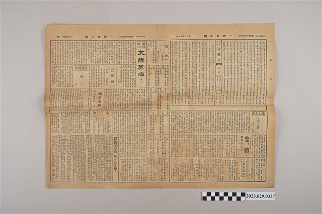 1.本物件為三六九小報社發行《三六九小報》第二百四十一號,發行人為趙雅福,本報正面為廣告頁,可見太原醫院、永茂商行、逢安治療所、新刊小說、長門屋玩具店等廣告;背面有雜爼專欄「雅言」、中國銀幕史、新聲律啟蒙等等;翻開內頁有開心文苑、詩壇、長篇小說「大陸英雄」、鞠譜遺稿等專欄文章。2.《三六九小報》發行時間至昭和5年 (1930)至昭和10年 (1935)。旨以刊登戲謔、針貶時事之文,反映當時的社會狀況。