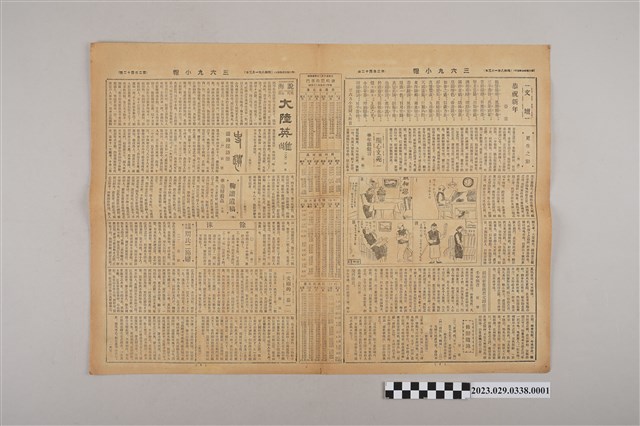1.本物件為三六九小報社發行《三六九小報》第二百四十二號,發行人為趙雅福,本報正面為廣告頁,可見王子典漢醫院、清井醫院、上海眼鏡製造公司、長門屋玩具店等廣告;背面有雜爼專欄「雅言」、中國銀幕史、新聲律啟蒙等等;翻開內頁有開心文苑、文壇「恭祝新年」、長篇小說「大陸英雄」、鞠譜遺稿等專欄文章。2.《三六九小報》發行時間至昭和5年 (1930)至昭和10年 (1935)。旨以刊登戲謔、針貶時事之文,反映當時的社會狀況。