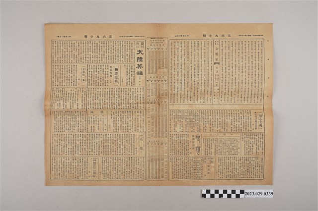 1.本物件為三六九小報社發行《三六九小報》第二百四十三號,發行人為趙雅福,本報正面為廣告頁,可見王子典漢醫院、清井醫院、新書發表、長門屋玩具店等廣告;背面有雜爼專欄「雅言」、荒唐生日記、新聲律啟蒙等等;翻開內頁有開心文苑、長篇小說「大陸英雄」、鞠譜遺稿等專欄文章,以及汽車時間略表。2.《三六九小報》發行時間至昭和5年 (1930)至昭和10年 (1935)。旨以刊登戲謔、針貶時事之文,反映當時的社會狀況。