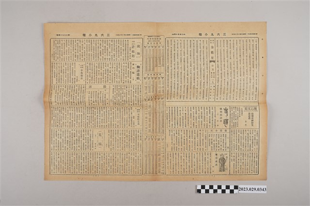 1.本物件為三六九小報社發行《三六九小報》第二百五十四號,發行人為趙雅福,本報正面為廣告頁,可見王子典漢醫院、清井醫院、新書發表、長門屋玩具店等廣告;背面有雜爼專欄「人世百面觀」、中國銀幕史、新聲律啟蒙、陋室諧談等等;翻開內頁有花轎、歷史小說「許媽超」、餐霞小紀、開心文苑等專欄文章,以及汽車時間略表。2.《三六九小報》發行時間至昭和5年 (1930)至昭和10年 (1935)。旨以刊登戲謔、針貶時事之文,反映當時的社會狀況。