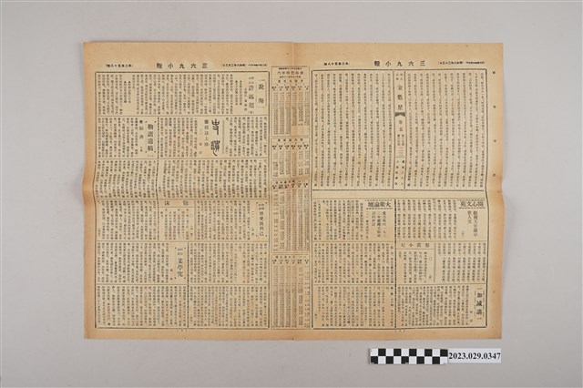 1.本物件為三六九小報社發行《三六九小報》第二百五十八號,發行人為趙雅福,本報正面為廣告頁,可見王子典漢醫院、永茂商行、新書發表、長門屋玩具店等廣告;背面有雜爼專欄「中國銀幕史」、文虎獵奇、新聲律啟蒙、詩壇等等;翻開內頁有歷史小說「許媽超」、餐霞小紀、開心文苑、鞠譜遺稿等專欄文章,以及汽車時間略表。2.《三六九小報》發行時間至昭和5年 (1930)至昭和10年 (1935)。旨以刊登戲謔、針貶時事之文,反映當時的社會狀況。