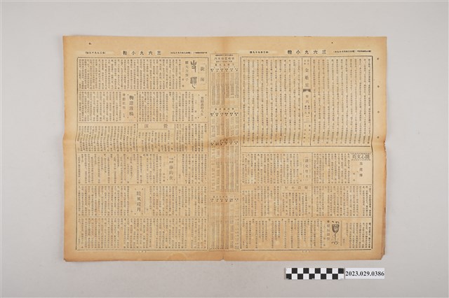 1.本物件為三六九小報社發行《三六九小報》第二百九十九號,發行人為趙雅福,正面為廣告頁,有カフヱー明星、永茂商行、蘭記書局、六和商店、西畑藤次郎、長門屋玩具店等廣告;背面雜爼專欄則有「東游日記」、「消暑小唱」等文章;翻開內頁有說海專欄「大力男子」、短篇小說「葬的夜」等文章。2.《三六九小報》發行時間自昭和5年 (1930)至昭和10年 (1935),旨以刊登戲謔、針砭時事之文,反映當時的社會狀況。