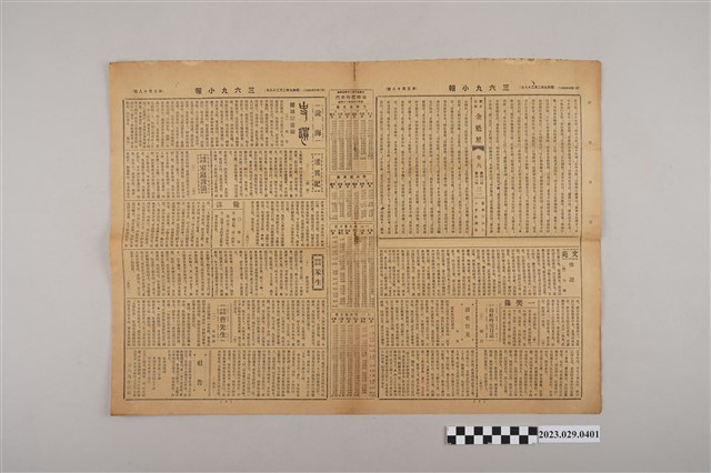 1.本物件為三六九小報社發行《三六九小報》第三百十八號,發行人為趙雅福,正面為廣告頁,有崇文堂書店、南生公司、長門屋玩具店、永茂商行、和光醫院、富士撞球俱樂部、永森記商行等廣告;背面雜爼專欄則有「東游日記」、「著名動物誌」等文章;翻開內頁有說海專欄「城隍靈驗」、實情小說「家庭波浪」等文章。2.《三六九小報》發行時間自昭和5年(1930)至昭和10年(1935),旨以刊登戲謔、針砭時事之文,反映當時的社會狀況。