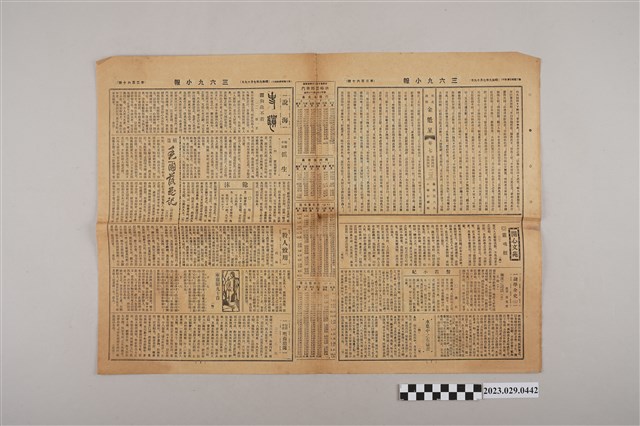 1.本物件為三六九小報社發行《三六九小報》第三百六十期,發行人為趙雅福,本報正面為廣告頁,有六和百貨店、天松食堂、崇文堂書店等商家廣告;背面有雜爼專欄「臺灣文化畧說」、「新聲律啓蒙」等文章;翻開內頁有短篇小說「偽生」、「明裔瑣聞」等文章。2.《三六九小報》發行時間自昭和5年(1930)至昭和10年(1935),旨以刊登戲謔、針砭時事之文,反映當時的社會狀況。