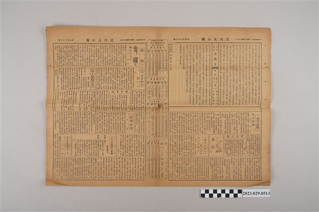 1.本物件為三六九小報社發行《三六九小報》第四百三十七號,發行人為趙雅福,正面有泰安合資會社、六和商店、和光醫院等7個廣告;背面文章為雜爼專欄「譚組厂軼聞」、「新聯話」、「通夜不寐之老人」等內容;翻開內頁有明史說部「金魁星」、太空論壇「雌雄說」、「餐霞小紀」、說海專欄有連載小說「魚壳大王」、短篇小說「現世因」等文章。2.《三六九小報》發行時間自昭和5年(1930)至昭和10年(1935),旨以刊登戲謔、針砭時事之文,反映當時的社會狀況。