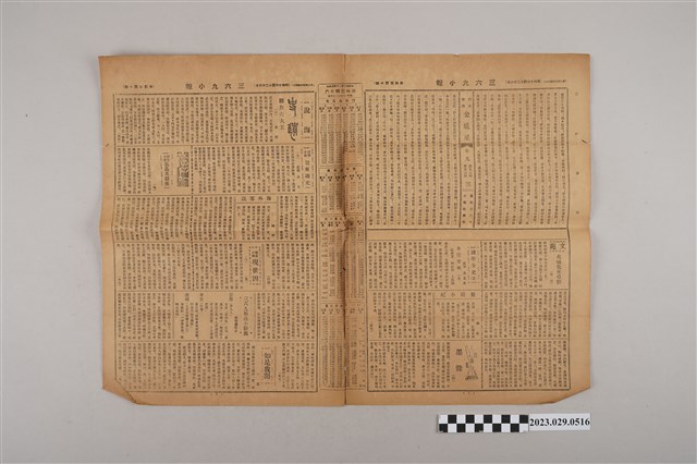 1.本物件為三六九小報社發行《三六九小報》第四百四十號,發行人為趙雅福,正面有泰安合資會社、六和商店、和光醫院等6個廣告;背面文章為雜爼專欄「荒唐齋小話」、「射虎大會誌略」、「生而能言之異孩」等內容;翻開內頁有明史說部「金魁星」、文苑專欄「兆墉先生弔辭」、「墨餘」、說海專欄有連載小說「魚壳大王」、歷史小說「孤島英雄傳」等文章。2.《三六九小報》發行時間自昭和5年(1930)至昭和10年(1935),旨以刊登戲謔、針砭時事之文,反映當時的社會狀況。