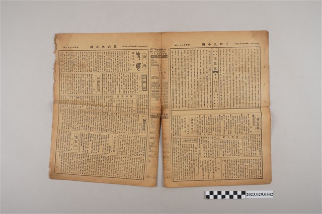 1.本物件為三六九小報社發行《三六九小報》第四百七十二號,發行人為趙雅福,正面為廣告頁,有泰安合資會社、和光醫院、王外科醫院、鴻文活版舍、蘭記書局等廣告;背面雜爼專欄則有「荒唐齋小話」、「黃莘田與徐懶雲」等文章;翻開內頁有說海專欄「街名七星」、滑稽小說「酒徒自述」等文章。2.《三六九小報》發行時間自昭和5年(1930)至昭和10年(1935),旨以刊登戲謔、針砭時事之文,反映當時的社會狀況。