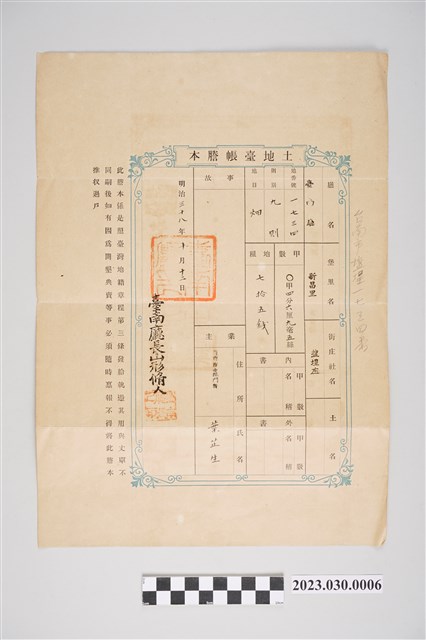 2023.030.0006 明治38年10月12日臺南廳長山形脩人給葉芷生臺南廳新昌里塩埕庄地番號1734土地臺帳謄本