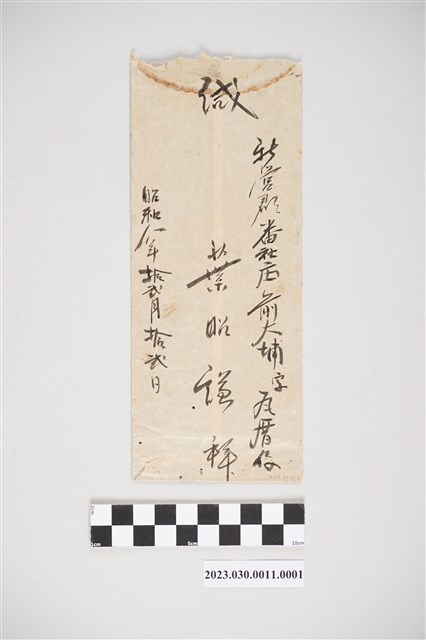 本件為臺南州新營郡番社庄崎子頭葉昭謙寄予臺南市大宮町二丁目葉朗初書信之信封袋,正面寫有「臺南市大宮町二丁目葉朗初殿」、「至急」等字,貼有兩張壹錢五厘郵票,銷戳時間為昭和8年12月13日。背面寫有「新營郡番社庄前大埔字瓦厝仔」、「葉昭謙拜」、「昭和八年拾弍月拾弍日」、「緘」等字。