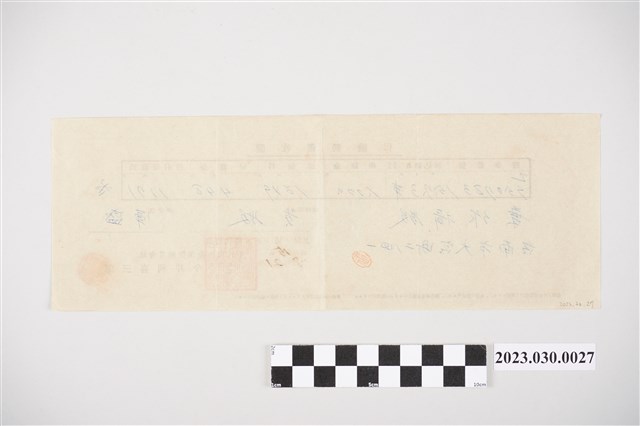 本件為保險費繳納收據,由千代田生命保險相互會社臺南軍盛代理店於昭和15年(1940)8月21日開立,付款人為葉作揖,其於同年7月3日繳納半年份保險費16圓19錢。本件使用該會社的收據用紙,底部有紋路,上方置有標題「保險料領收證」。鈐有「千代田生命保險相互會社印」朱文方印(套印)及「領收今井社長」朱文圓印;背後有則有「王」朱文圓印。付款人葉作揖(1903-1966),臺南市人,臺南葉大觀家族葉朗初(1874-1935)與陳進發(1871-1945)之子。臺北開南商工畢業,曾任職臺南州農會書記、臺南市政府主計室。本件為日治時期葉作揖投保文書的其中一件,其於1935-1945年間投保並繳納保費,各期共20張收據皆妥善收納,本件為其收納的第11張收據。此批物件當可見證日治中期起臺灣生命保險(即人壽保險)產業發展,以及臺灣人參與投保之過程。