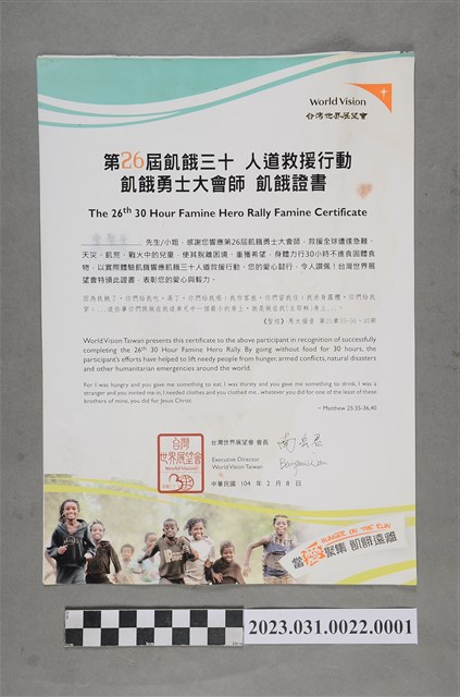 曾聖光第26屆飢餓三十證書