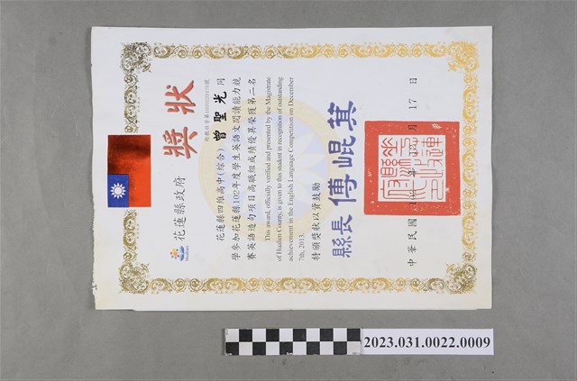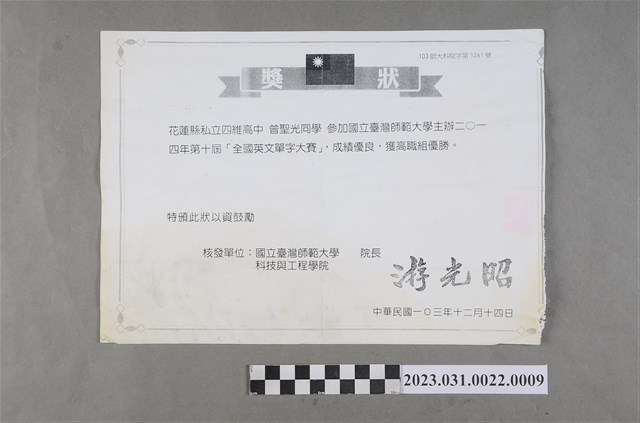 2023.031.0022.0009 曾聖光2014年第十屆全國英文單字大賽優勝獎狀影本