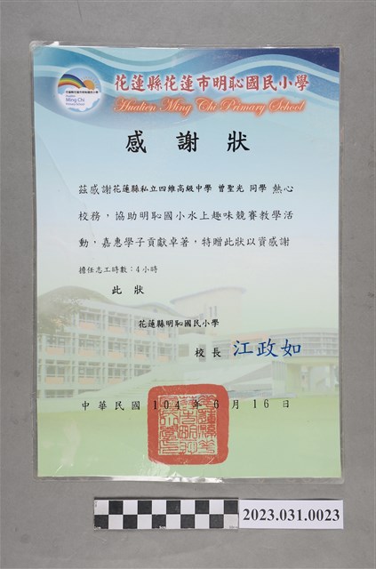 2023.031.0023 104年曾聖光花蓮縣花蓮市明恥國小感謝狀獎狀
