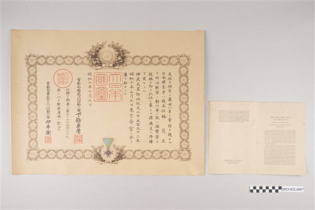 2023.032.0007 昭和7年7月9日大日本帝國授予林茂生瑞寶章證書組
