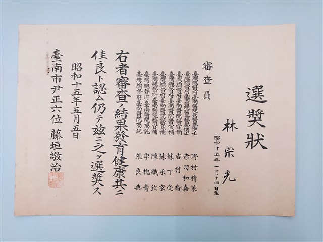 昭和15年5月5日林宗光獲選發育健康優良獎狀