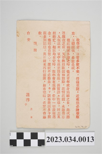 為台南縣隆田郵局所印製制式之軍旅明信片,正面為收寄者地址寄交格式,寄件者地址為台南隆田郵局信箱。明信片背面為制式的從軍問候文字,由卓朝英寄玉井教會轉交羅新民叔公之軍中明信片