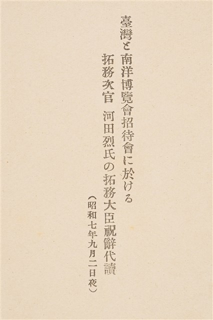 昭和7年9月2日拓務次官何田烈氏於博覽會招待會上代宣讀拓務大臣祝賀詞