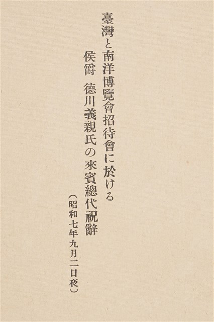 昭和7年9月2日侯爵德川義親氏於博覽會招待會上宣讀來賓總代表祝賀詞