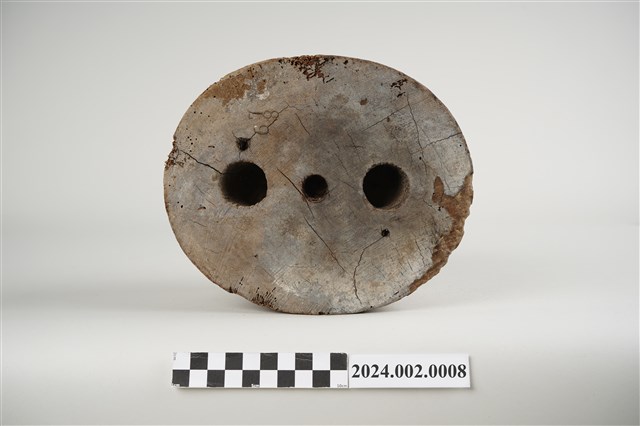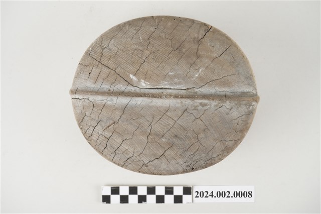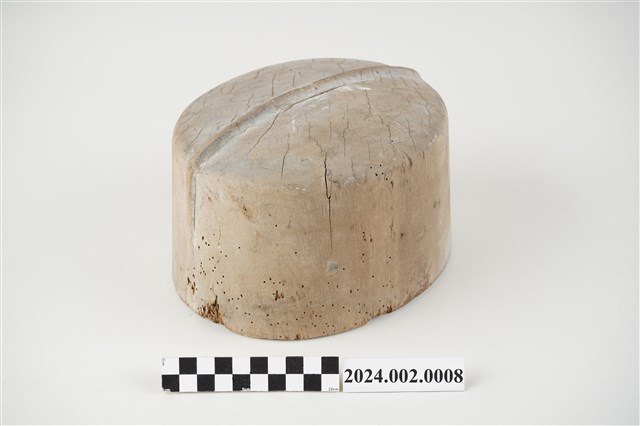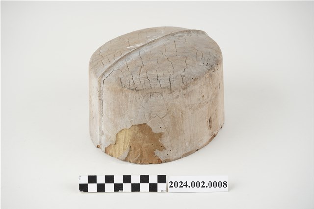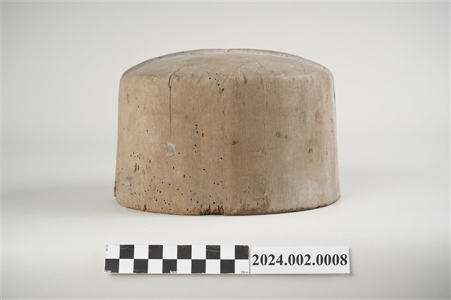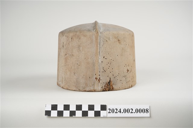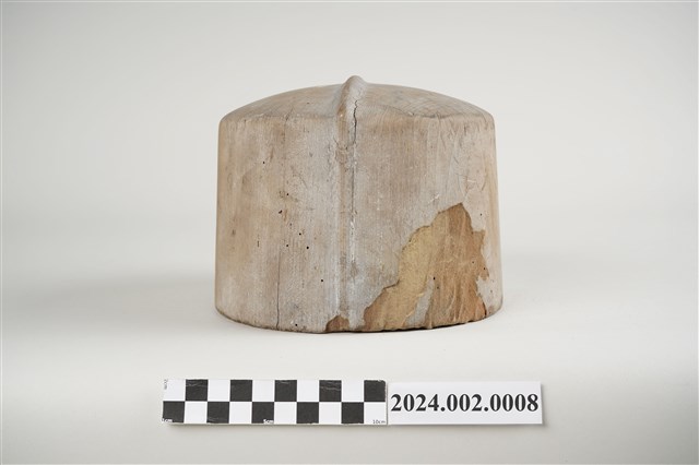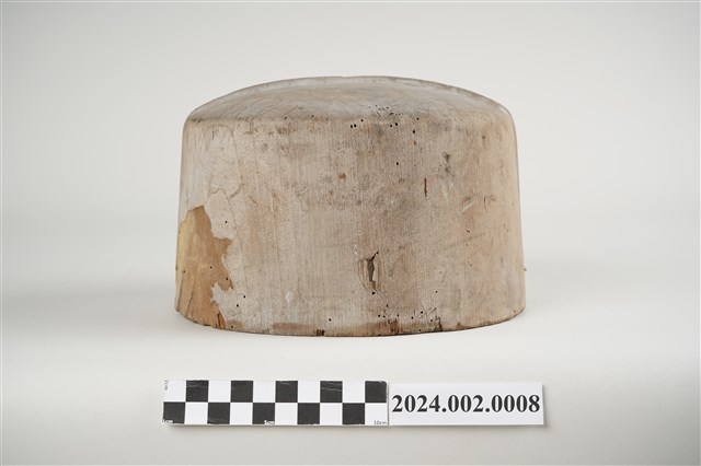 漁夫帽木帽模,通體可見木紋,外觀狀似平頂火山。帽頭部較高凸,頂平,下底略為外敞,底平。