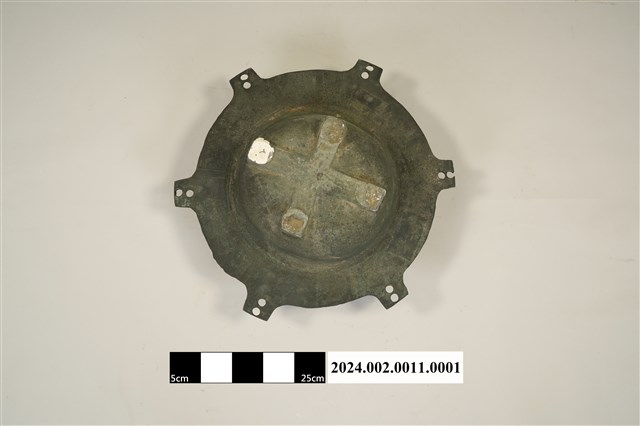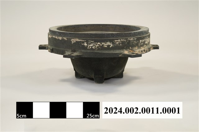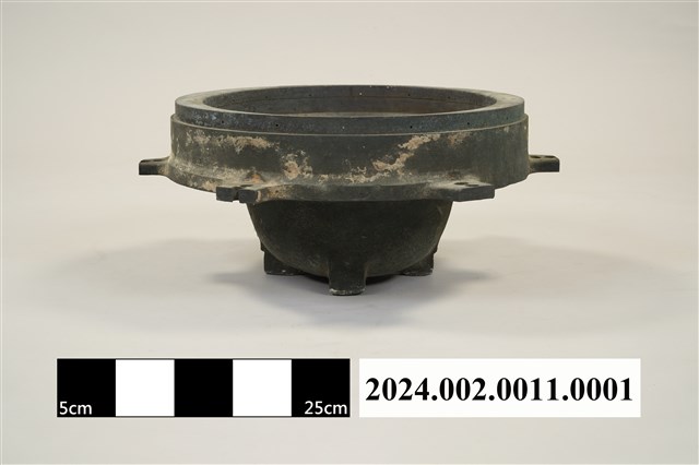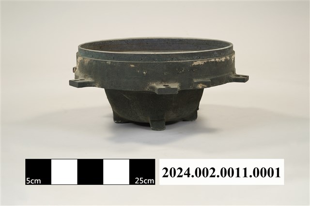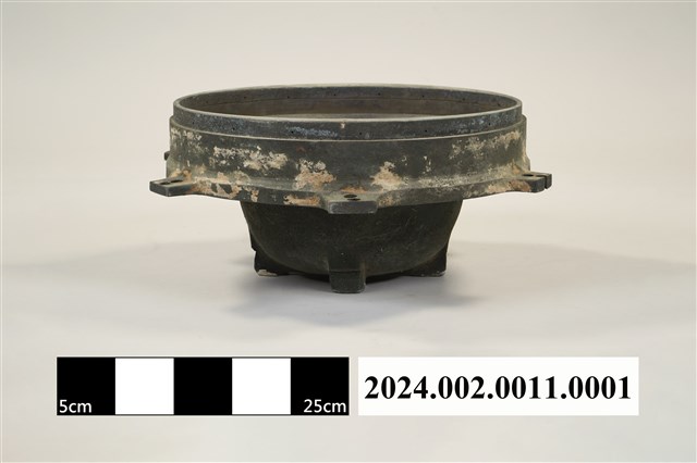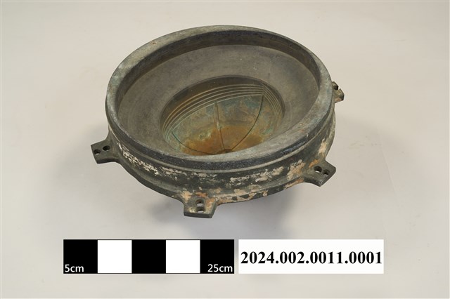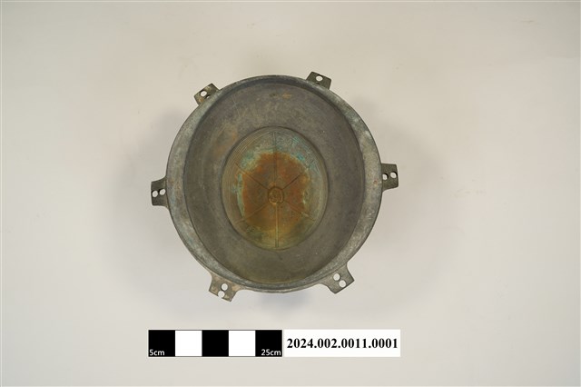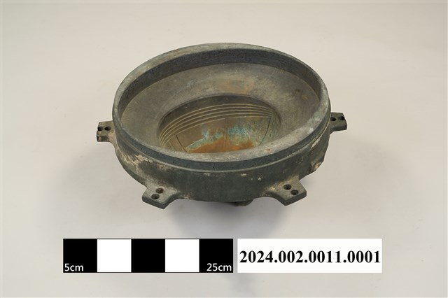 本件為郵差帽銅質頭形帽模,呈凹槽狀,銅質結構,橡膠凹模。製作時需搭配油壓機操作,將平面的塑膠板材壓製成立體的郵差帽帽子頭形。