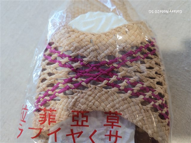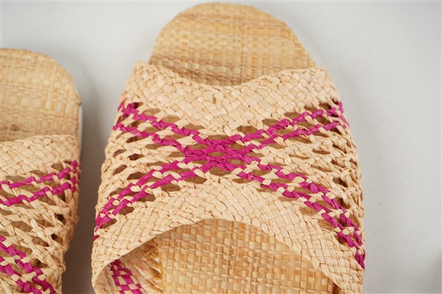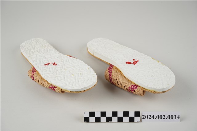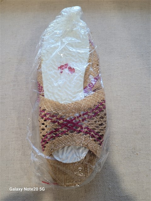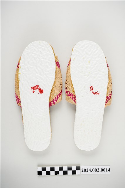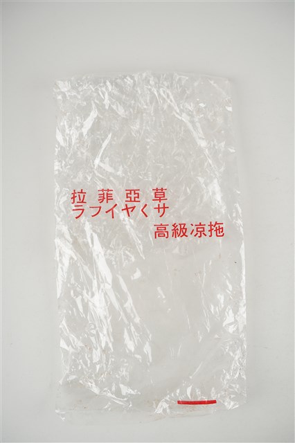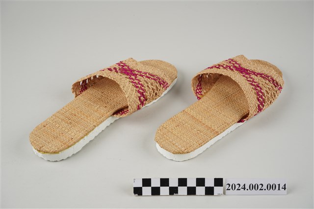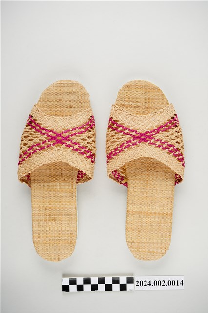 1. 本件為振發蓆帽行晚期生產之產品,拉菲亞草編織拖鞋,共1雙2隻。拖鞋鞋底以白色膠棉製成,鞋內襯與鞋面均以拉菲亞草編織而成,內襯邊之細密舒適,鞋面則編織成鏤空狀,並有紫紅色交叉線裝飾點綴,草編拖鞋主要作為夏季居家室內用拖鞋。本件為全新品未拆封,外層透明塑膠包裝袋上印有「拉菲亞草高級涼拖 ラフィヤクサ」等紅色字。2. 拉菲亞草是由拉菲亞科棕櫚樹屬的葉子取得之纖維扁條,具有很強的韌性,外表光滑的天然蠟質,具有些微的撥水性,且編織牢固,透氣性佳。
