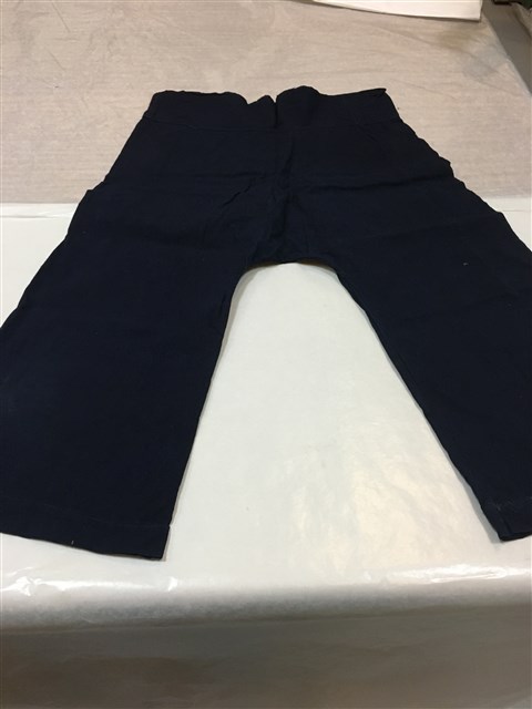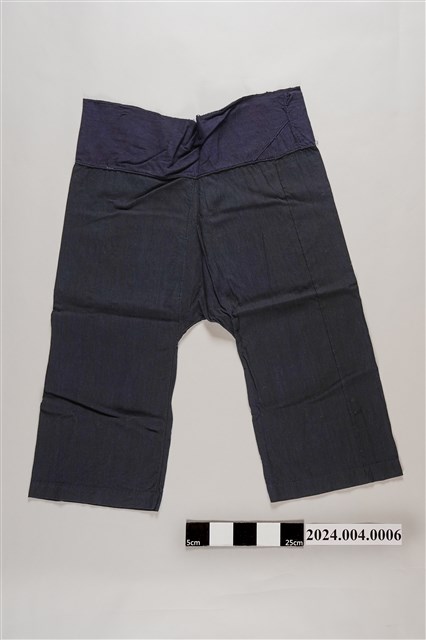 據口述為張陳氏員女士所有,張陳氏員女士(1864-1946)為臺中墩仔腳人,40餘歲時因鄰居介紹開始到墩仔腳教會,張家一族之基督信仰始於此。本件屬於臺灣早期婦女之服飾,為最普遍之中式褲裝,寬腰、寬褲腿,活動方便。本件穿著時褲腰左右互疊,需繫上腰帶以打結固定,腰帶部份為黑色。
