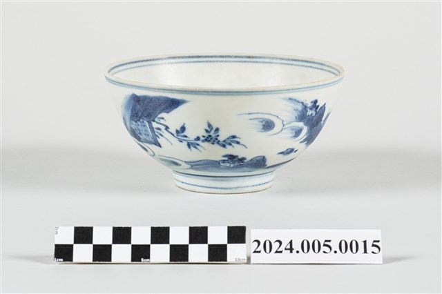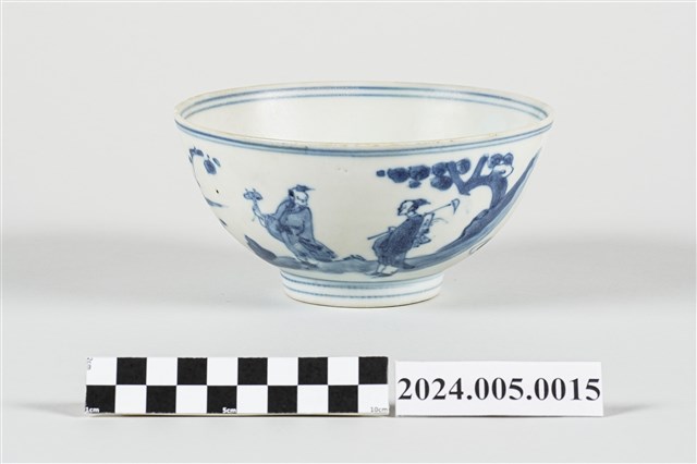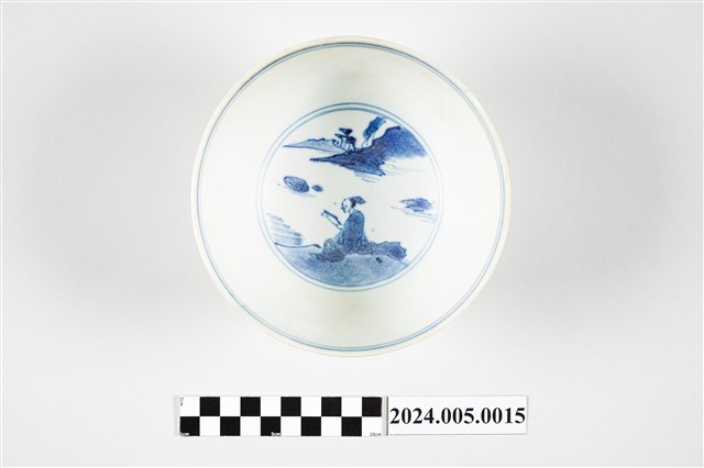 此為17世紀中國景德鎮窯燒造之釉下青花彩繪敞口碗,所見碗心飾以高士圖,器腹外壁則飾有山水紋紋,器底為青花單圈楷書六字雙行款「大明成化年製」。